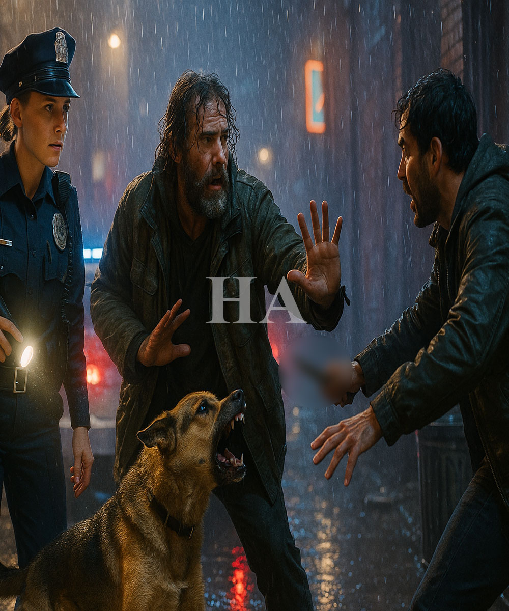 El hombre contra la pared parecía otra pieza del paisaje urbano: ropa empapada, barba enmarañada, cabello pegado a la frente. Pero había algo distinto en sus ojos, una urgencia tensa que no combinaba con el abandono. A su lado, un perro mestizo —costillas insinuadas bajo el pelaje oscuro, mirada atenta— gruñó hacia el interior del callejón.