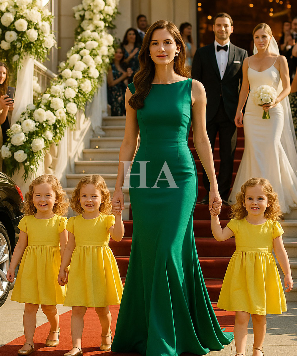 El coche negro se detuvo. El chófer bajó y abrió la puerta con gracia ensayada. Primero salieron tres pequeñas niñas con vestidos amarillos a juego, tomadas de la mano, sus rizos rebotando mientras caminaban por la alfombra roja. Detrás de ellas apareció Emma, con un elegante vestido verde esmeralda. Su presencia era imponente pero serena, su belleza radiante y su fuerza innegable.