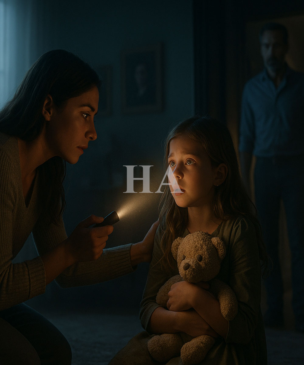 Esperó hasta que Clara estuviera sentada tranquilamente en el pasillo, sosteniendo su oso de peluche como de costumbre. Elena tomó su teléfono de nuevo y encendió la linterna. fingiendo estar arreglando algo cerca de un gabinete. Luego movió lentamente la mano de un lado a otro entre la luz y la cara de Clara, proyectando sombras claras.