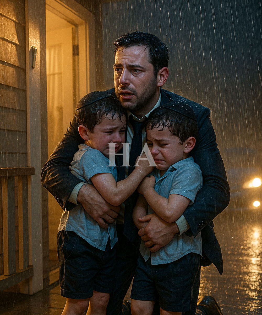 Los faros de su sedán iluminaron el porche como un escenario. Allí estaban Noah y Aaron, cinco años recién cumplidos, encogidos en el escalón de madera, los quipás pegados a la cabeza como hojas, las rodillas abrazadas al pecho y los pies descalzos sobre la tabla empapada. Cuando vieron los faros, las dos figuras se pusieron de pie a la vez, resbalaron y corrieron hacia el coche a trompicones. David clavó el freno y, antes de apagar el motor, escuchó esa mezcla de risa y llanto que solo hacen los niños cuando por fin llega el adulto al que estaban apostando toda su esperanza.
