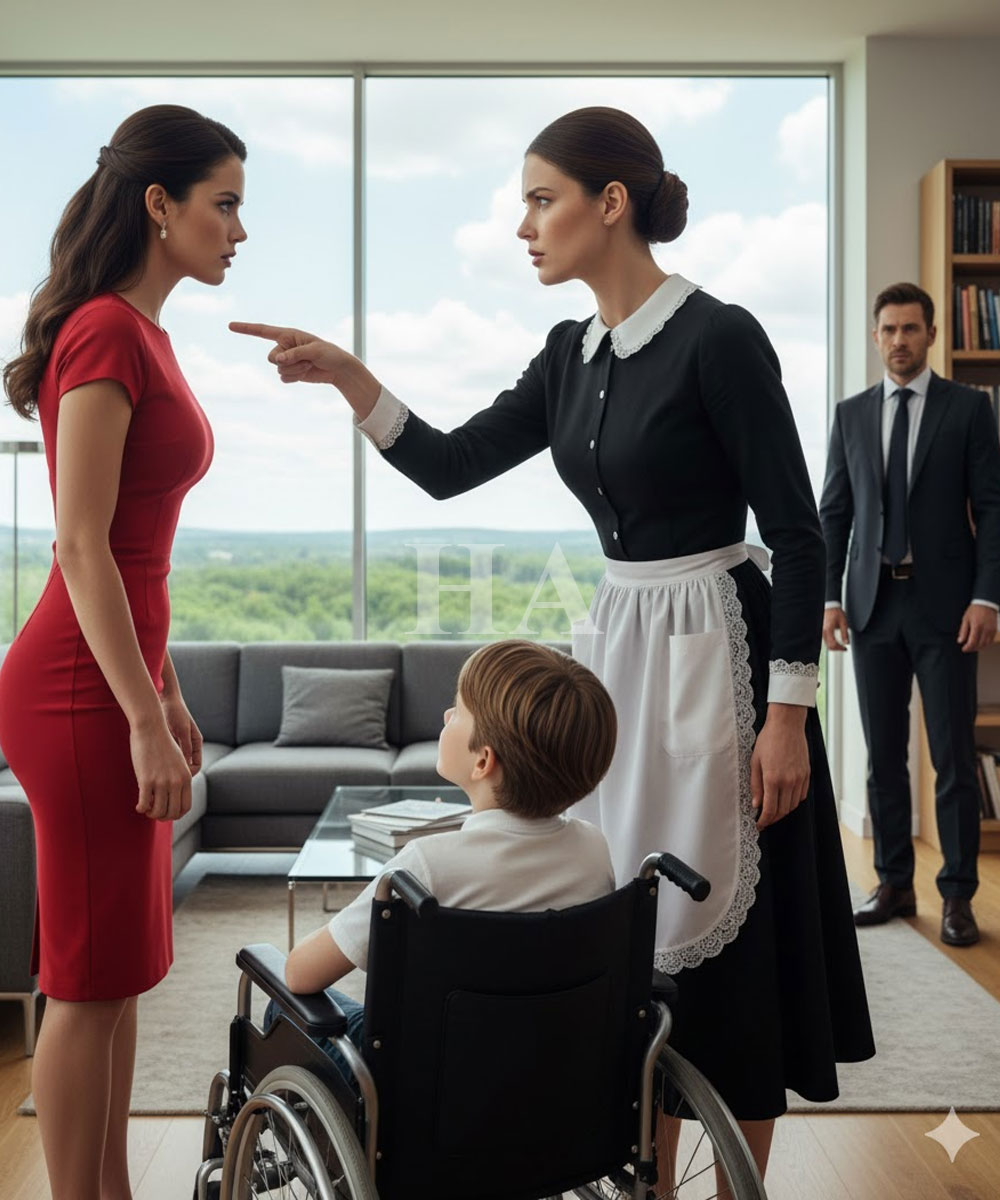 El niño en silla de ruedas de 7 años intentaba contener el llanto mientras su madrastra lo humillaba sin piedad. Pero antes de que ella dijera algo peor, la empleada doméstica apareció en la puerta y gritó, “¡No hagas eso.” La voz resonó por toda la sala. El millonario, que acababa de llegar, quedó paralizado al ver la escena.