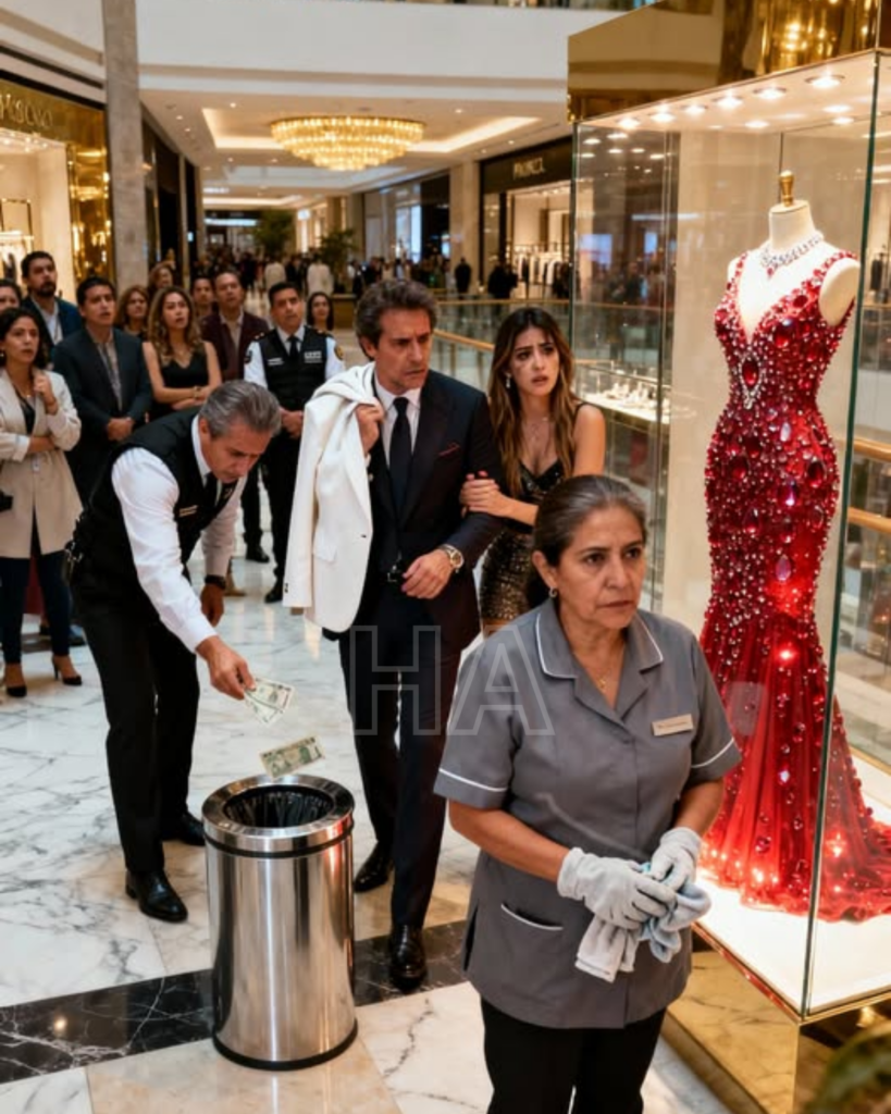 Frente a un escaparate que exhibía el famoso “Fénix de Fuego” —un vestido de un millón de dólares adornado con rubíes auténticos—, había una mujer. Llevaba un uniforme gris de limpieza, un trapo en la mano y el cabello recogido con una sencillez que gritaba “clase trabajadora”.