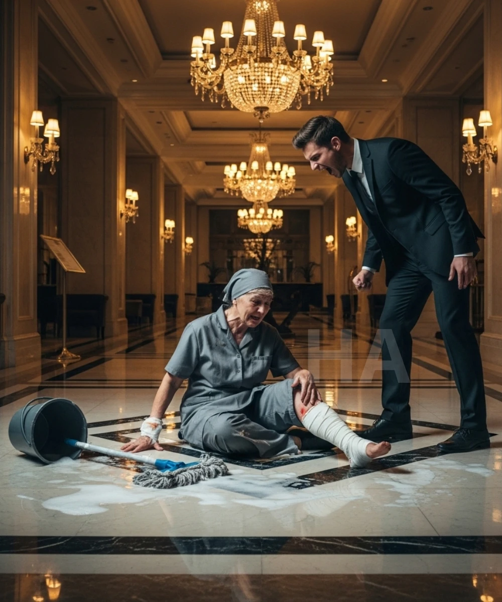 Ella acababa de escurrir su trapo, con los ojos fijos limpiando una esquina del amplio piso de mármol dentro de Apex Towers. El trapo estaba empapado y sus manos eran débiles. Al lanzarlo hacia el balde, salieron unas gotas que cayeron sobre Tommy, que acababa de entrar con ruido, perfume y enojo.