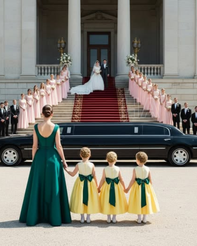 El coche negro se detuvo. El chófer bajó y abrió la puerta con gracia ensayada. Primero salieron tres niñas con vestidos amarillos a juego, tomadas de la mano, con sus rizos saltando mientras caminaban por la alfombra roja. Detrás de ellas emergió Emma, con un elegante vestido verde esmeralda. Su presencia era imponente y serena a la vez, su belleza resplandecía y su fortaleza era innegable.