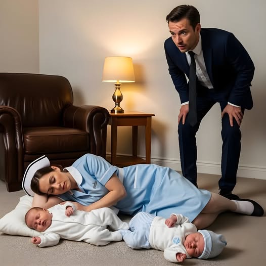 En medio del salón, bajo la luz dorada de una lámpara, vio a la mujer de la limpieza. Dormía profundamente sobre la alfombra, con su uniforme turquesa arrugado y el cabello suelto. A su lado, dos bebés gemelos descansaban plácidamente. Uno tenía una diminuta mano aferrada al dedo de la mujer; el otro, apoyado en su pecho, respiraba con calma, como si el latido de su corazón fuera su arrullo.