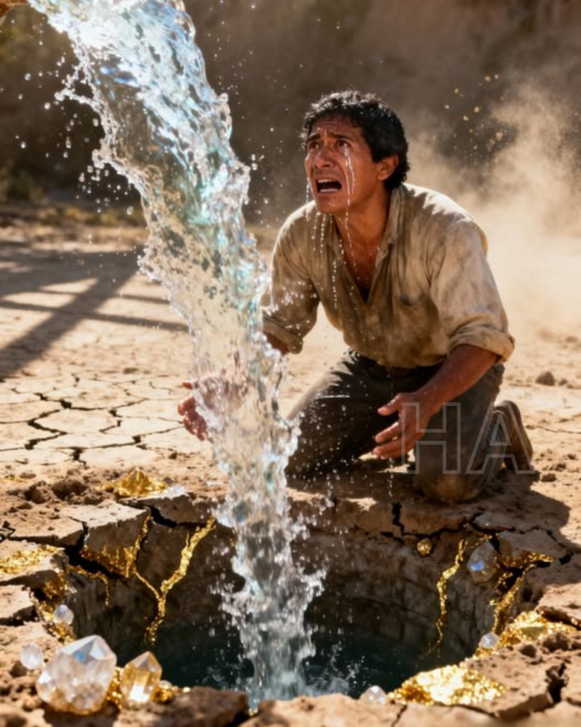 De repente, un chorro de agua cristalina y fresca brotó con una fuerza descomunal, empujando a Mateo hacia arriba. No era un pozo seco; era la entrada a un acuífero subterráneo virgen que la sequía no había podido tocar, protegido por una barrera de roca mineralizada. Mateo salió del pozo empapado, gritando de alegría, mientras el agua bendita inundaba la tierra seca y el oro brillaba bajo el sol mexicano.
