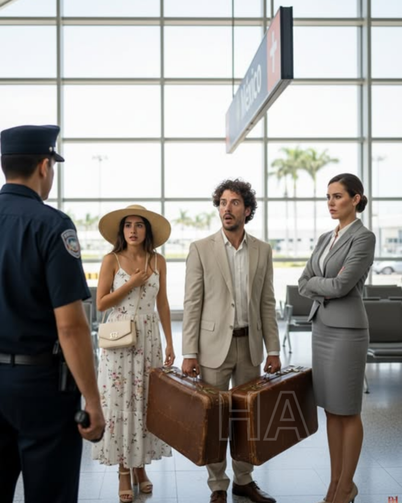 Dos minutos después, aparecieron dos agentes uniformados y un hombre serio de traje —seguridad del aeropuerto— acercándose al mostrador.
