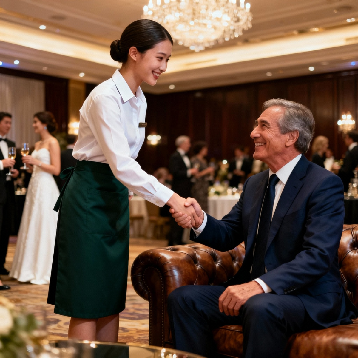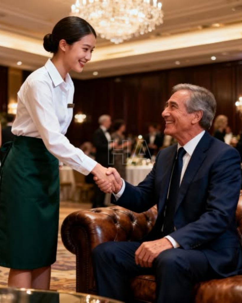 La incomodidad no necesita traducción. Mientras tanto, entre bandejas y vasos vacíos, Julia caminaba ágilmente por la sala, esquivando conversaciones ajenas. Tenía 24 años, mirada alerta y una expresión que intentaba permanecer neutral, aunque sus pensamientos rara vez permanecían en silencio. Vestía el uniforme del personal: camisa blanca, chaleco negro y un delantal pulcramente planchado.