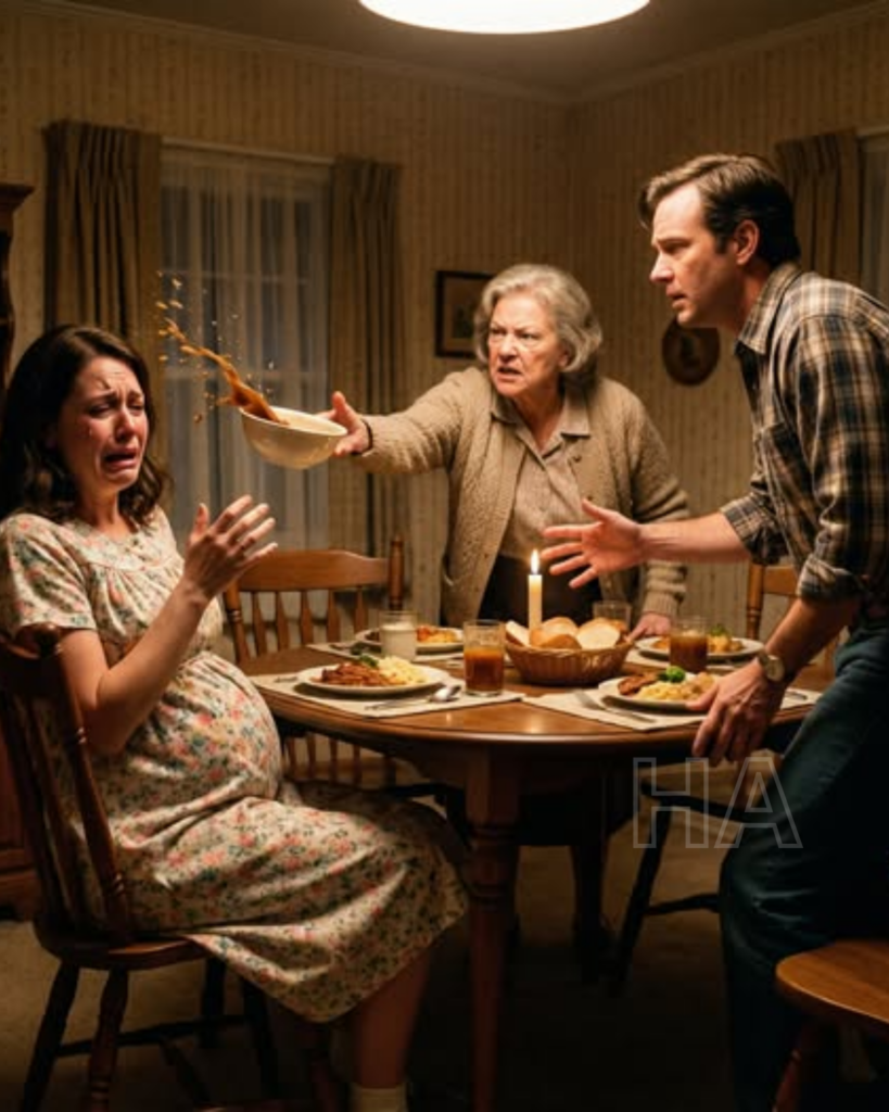 Emily abrió la boca para disculparse, pero no tuvo tiempo. Margaret, en un arrebato de ira, agarró el plato y lanzó la sopa caliente directamente sobre ella. El líquido hirviendo le cayó en el cuello y los hombros. Emily gritó, llevándose las manos al vientre por instinto, entre dolor y shock.