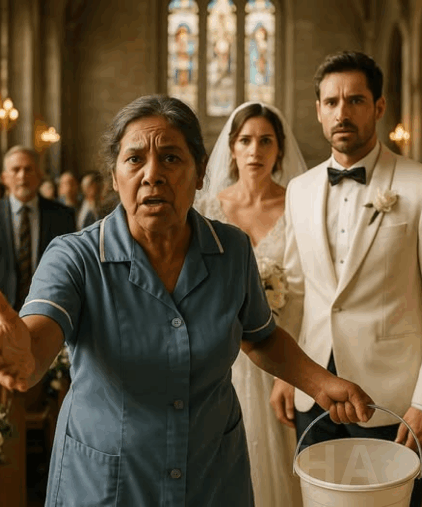 El murmullo creció a medida que los invitados notaban su presencia. Nadie entendía por qué una mujer vestida con el uniforme de limpieza, con el delantal todavía húmedo y las manos manchadas de cloro, se atrevía a interrumpir la ceremonia más esperada de la ciudad.