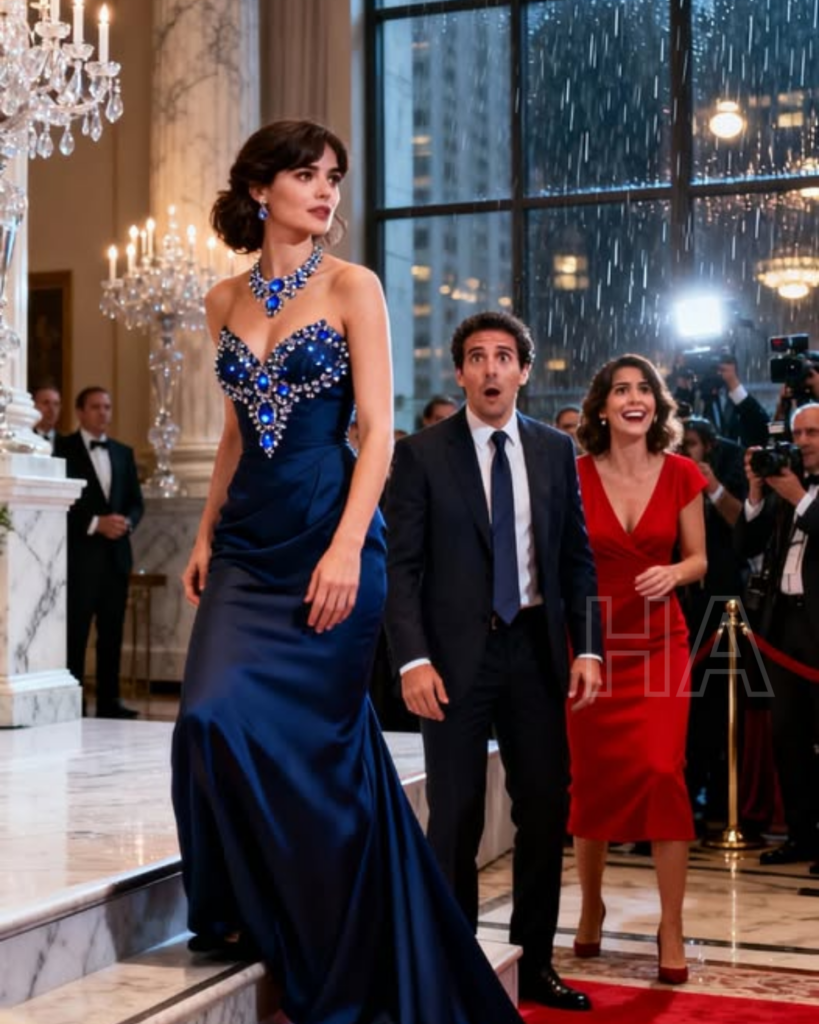 El jadeo colectivo fue como una ola. Debajo no había un vestido humilde, ni rebajas, ni invisibilidad. Lily llevaba un vestido azul medianoche que parecía hecho del cielo. Brillaba con zafiros reales, miles, como si la noche se hubiera cosido a su piel. En su cuello, un diamante que hizo callar a las mujeres de primera fila: la Luna Azul, una joya de leyenda.