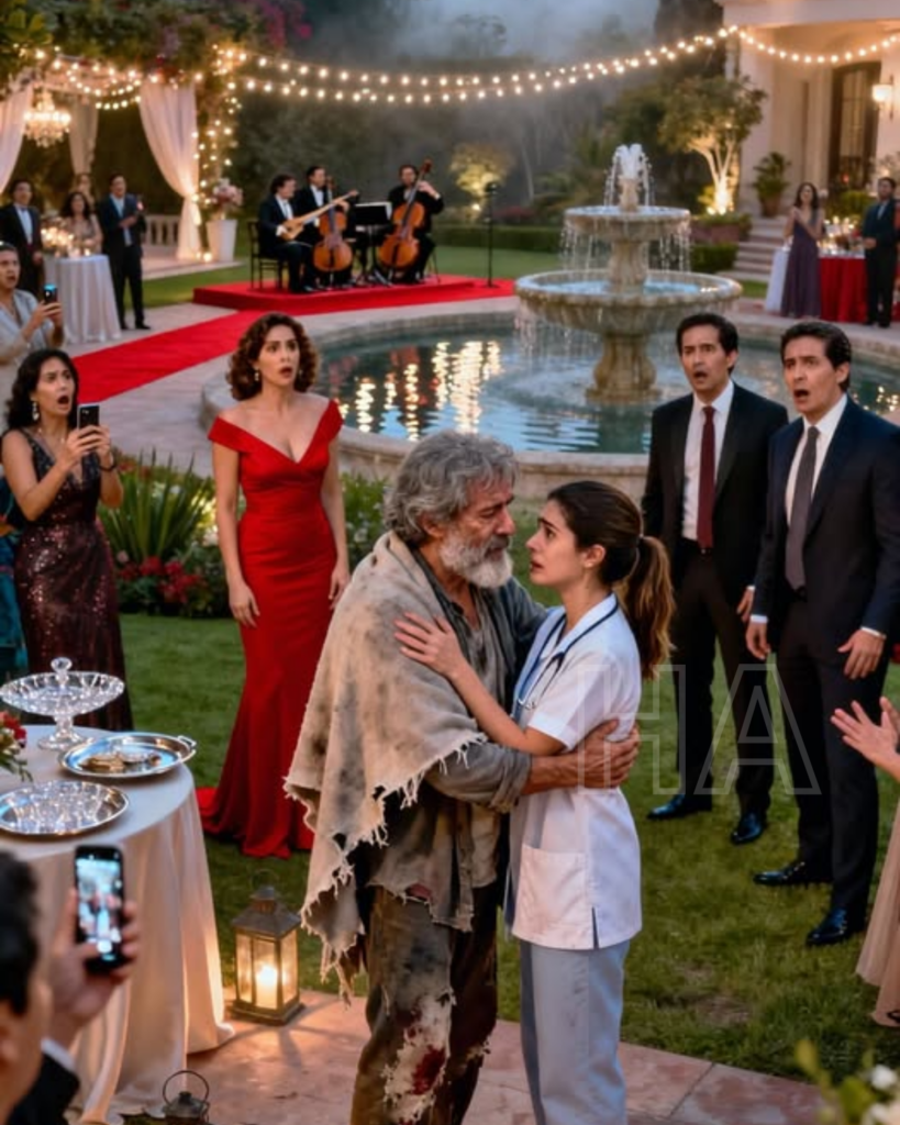 Cuando los invitados comenzaron a aglomerarse en el jardín, la música se detuvo por un segundo extraño. No porque alguien diera una orden, sino porque la escena en la reja principal parecía un error del universo: un hombre mayor, con la barba crecida y desordenada, ropa rasgada, un pantalón manchado y una manta raída sobre los hombros, caminando con una dignidad que no encajaba con su aspecto.