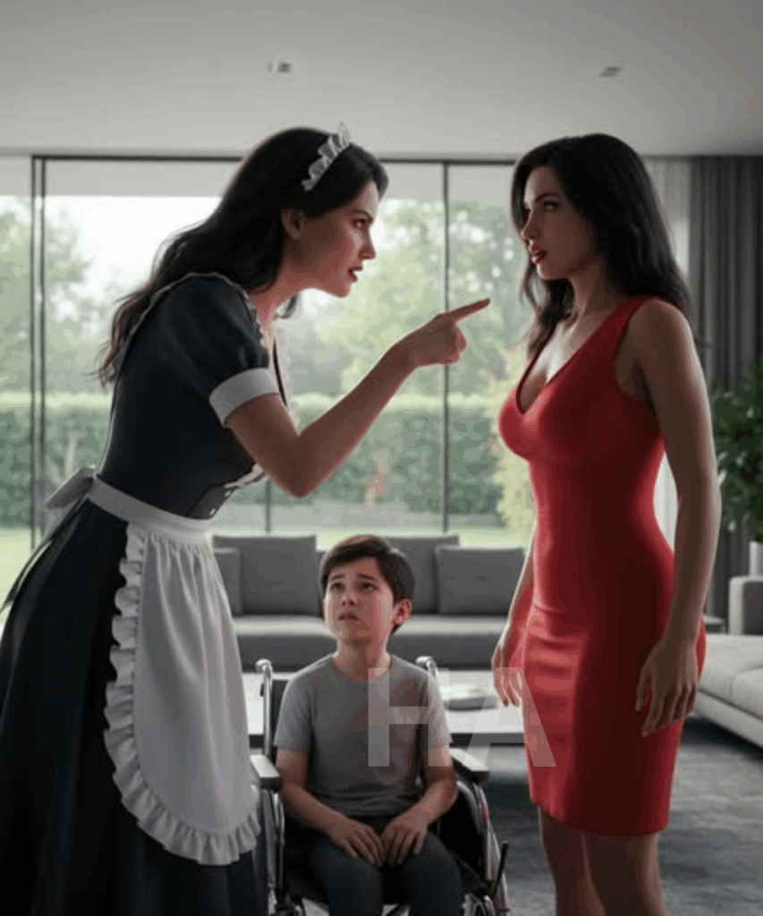 El niño en silla de ruedas de 7 años intentaba contener el llanto mientras su madrastra lo humillaba sin piedad. Pero antes de que ella dijera algo peor, la empleada doméstica apareció en la puerta y gritó, “¡No hagas eso.” La voz resonó por toda la sala. El millonario, que acababa de llegar, quedó paralizado al ver la escena.