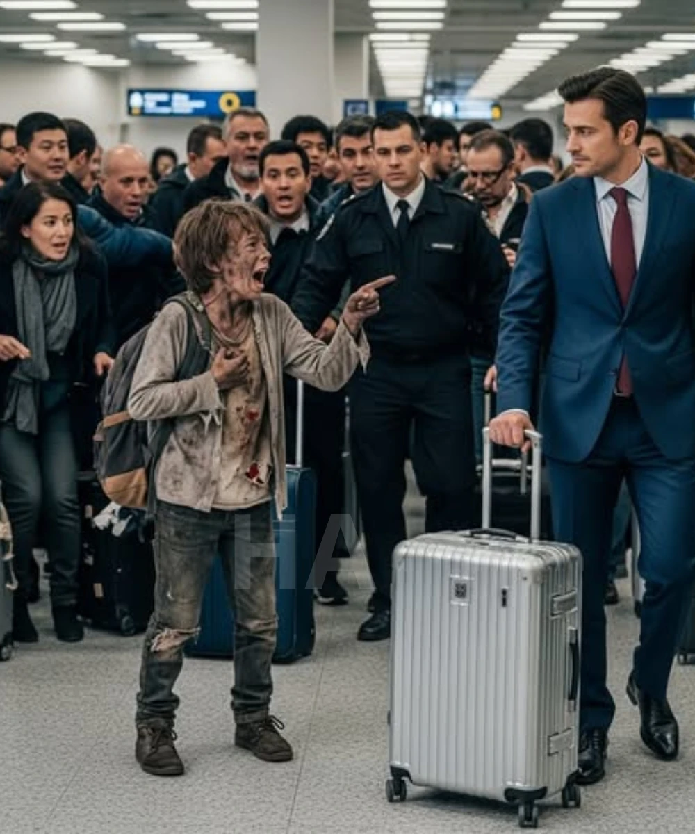 La voz fue aguda, urgente, y atravesó el bullicio de la terminal del Aeropuerto Internacional John F. Kennedy. Decenas de viajeros giraron la cabeza, buscando la fuente. Cerca de unas máquinas expendedoras estaba un muchacho delgado, con la ropa hecha jirones, el cabello sucio y una mochila rota colgando del hombro. Sus ojos estaban fijos en un hombre: un empresario alto, elegante, vestido con un traje azul marino y una maleta de mano impecable.