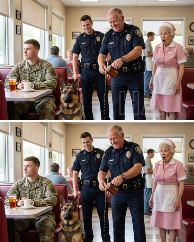 El café oscuro se derramó despacio, formando un charco que avanzó por el mosaico hasta quedar a unos centímetros de las patas de una pastora alemana sentada junto a una mesa del rincón. La perra no se movió. Sus orejas apenas se tensaron, como si escuchara una orden que todavía no llegaba.