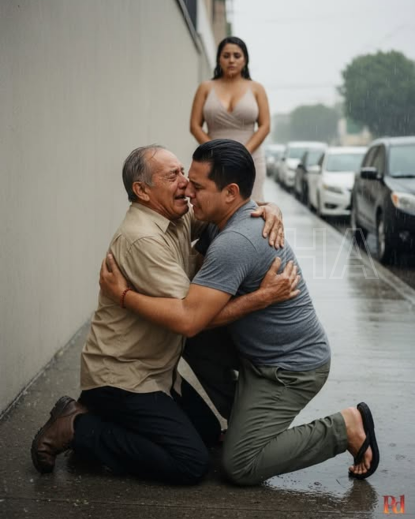 Padre e hijo se abrazaron bajo la lluvia, como si el tiempo se hubiera detenido solo para ellos.
