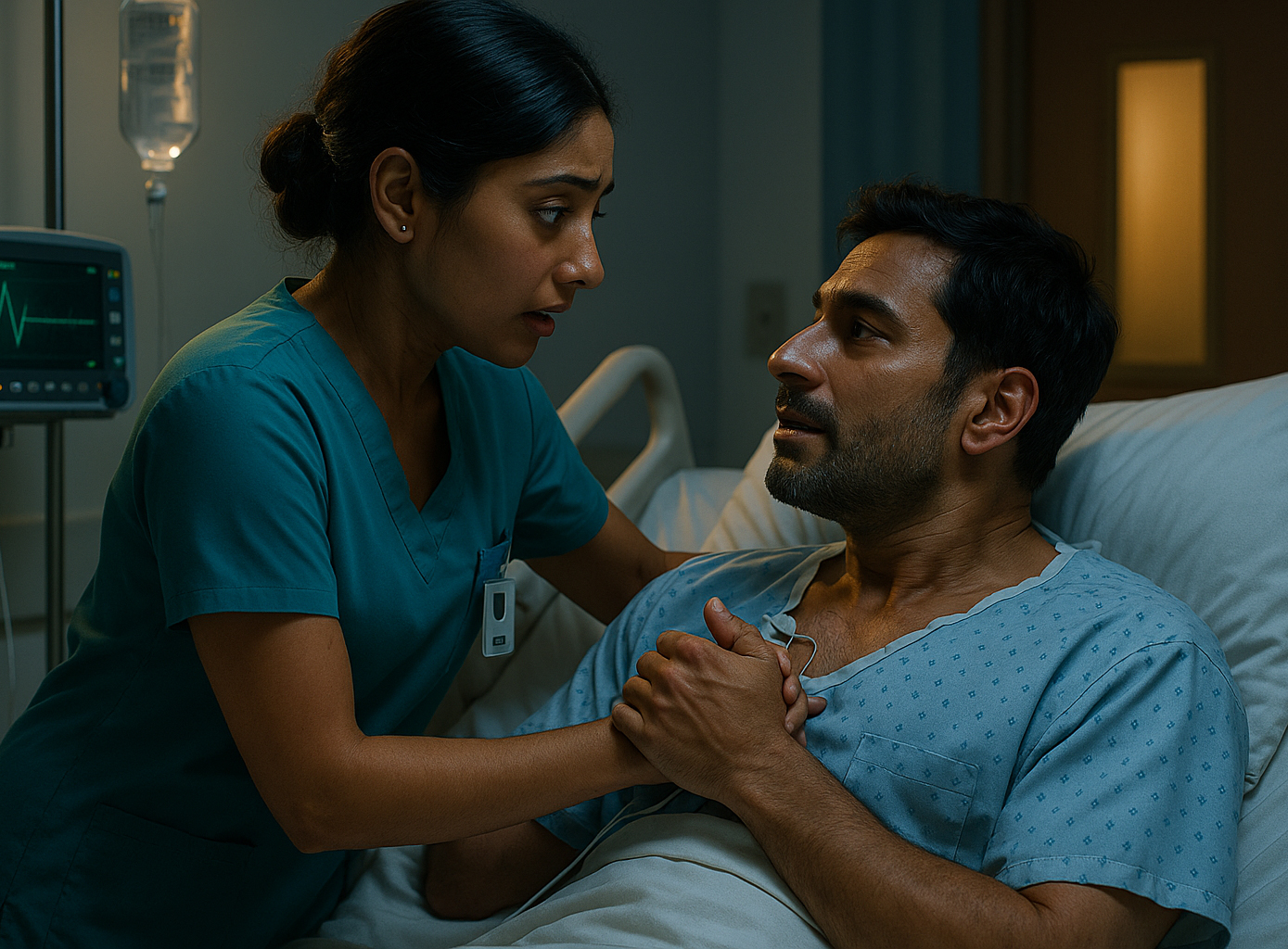 Una tarde, mientras Ananya revisaba el suero y se disponía a irse, sintió que el Sr. Malhotra sujetaba suavemente su muñeca.