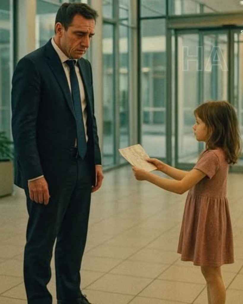 La voz temblorosa de una niña de siete años rompió el silencio elegante del vestíbulo de cristal de una gran empresa tecnológica. Sus manos pequeñas apretaban un sobre arrugado como si fuera un tesoro.